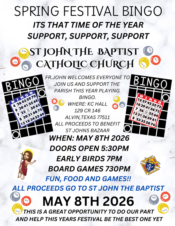 The Knights of Columbus will be hosting a special Friday Night Bingo in support of our church bazaar. We warmly invite everyone who is able to attend to please consider joining us for this meaningful event.